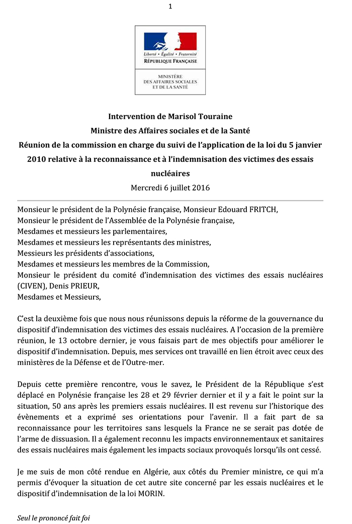 Intervention de Marisol TOURAINE lors de la réunion de la commission reconnaissance et indemnisation des victimes des essais nucléaires. Categories: Actualités, Environnement, Politique, SociétéPar Léa7 juillet 2016Laisser un commentaire Author: Léa Post navigationPreviousPrevious post:Parti Socialiste de l’Ain CP sur la bourse au mériteNextNext post:Les 15 et 16 juillet, la foire aux vins de Culoz : du jamais vu !