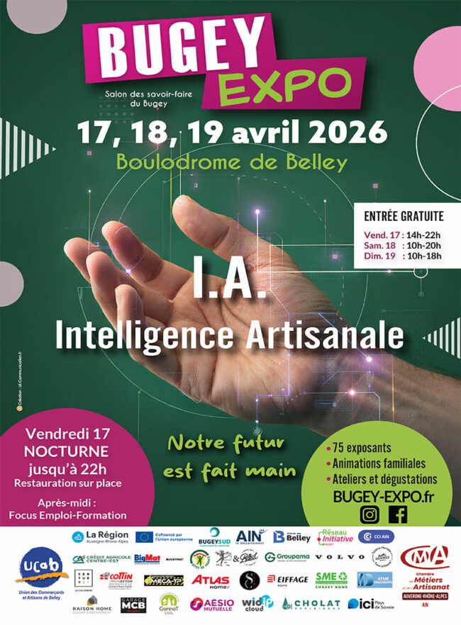 Le salon BUGEY EXPO revient les 17, 18 et 19 avril 2026 au boulodrome de Belley pour fêter sa 20é édition… et promet un millésime exceptionnel ! Durant trois jours, 75 exposants – artisans locaux, métiers de bouche, professionnels du bâtiment, métiers d’art, services et producteurs – dévoileront toute la richesse et le savoir-faire du…