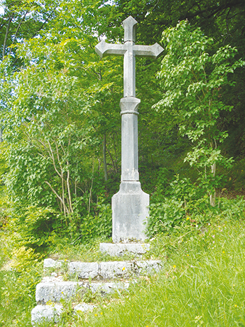 Faites demi-tour pour reprendre l’itinéraire de la boucle des Tours de César en montant la route goudronnée. A l’intersection du lieu-dit « La Tour », prenez le temps de faire un crochet en continuant sur quelques dizaines de mètres en direction du parking du Château Barthelier, dont il ne reste rien sauf un pan de mur. L’intérêt de ce détour se situe juste après le parking en continuant sur la route à votre droite, il s’agît de la croix des mariages. La légende raconte que les moines de Cessens, en 1137, quittèrent le village pour aller s’installer à l’abbaye d’Hautecombe. Au moment de leur départ, ils offrirent de l’argent aux jeunes filles les plus pauvres et établirent une croix composée de deux branches sur le bord du chemin. Par la suite, une croix en dur fut érigée et les jeunes filles du pays avaient coutume d’aller s’y recueillir dans l’espoir de trouver un époux.