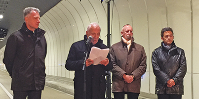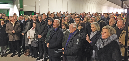 2016 (mai) : débouché de la galerie de sécurité, 1500 m de roche creusée en à peine 1 an. (Photo des 2 équipes se rejoignant)