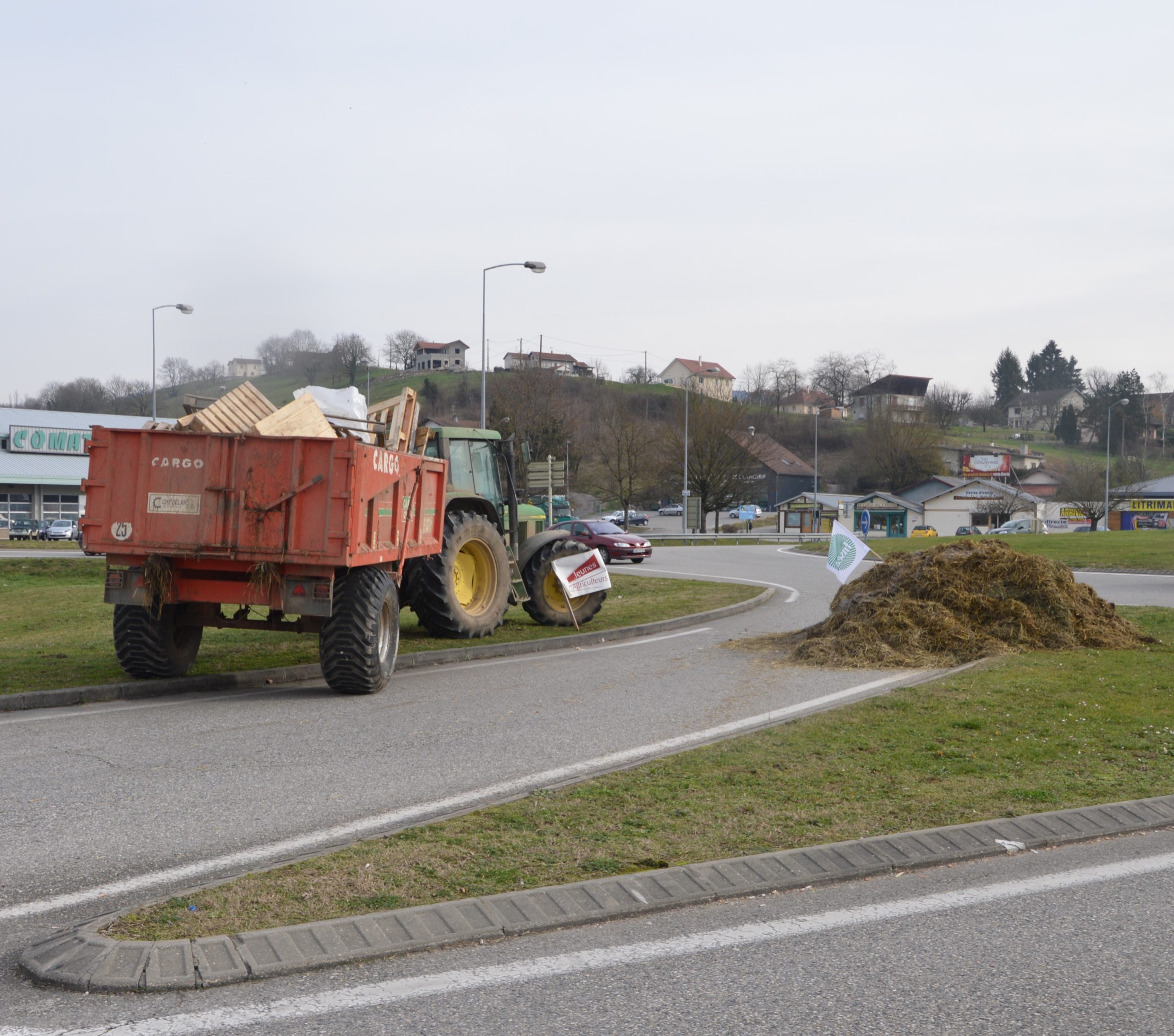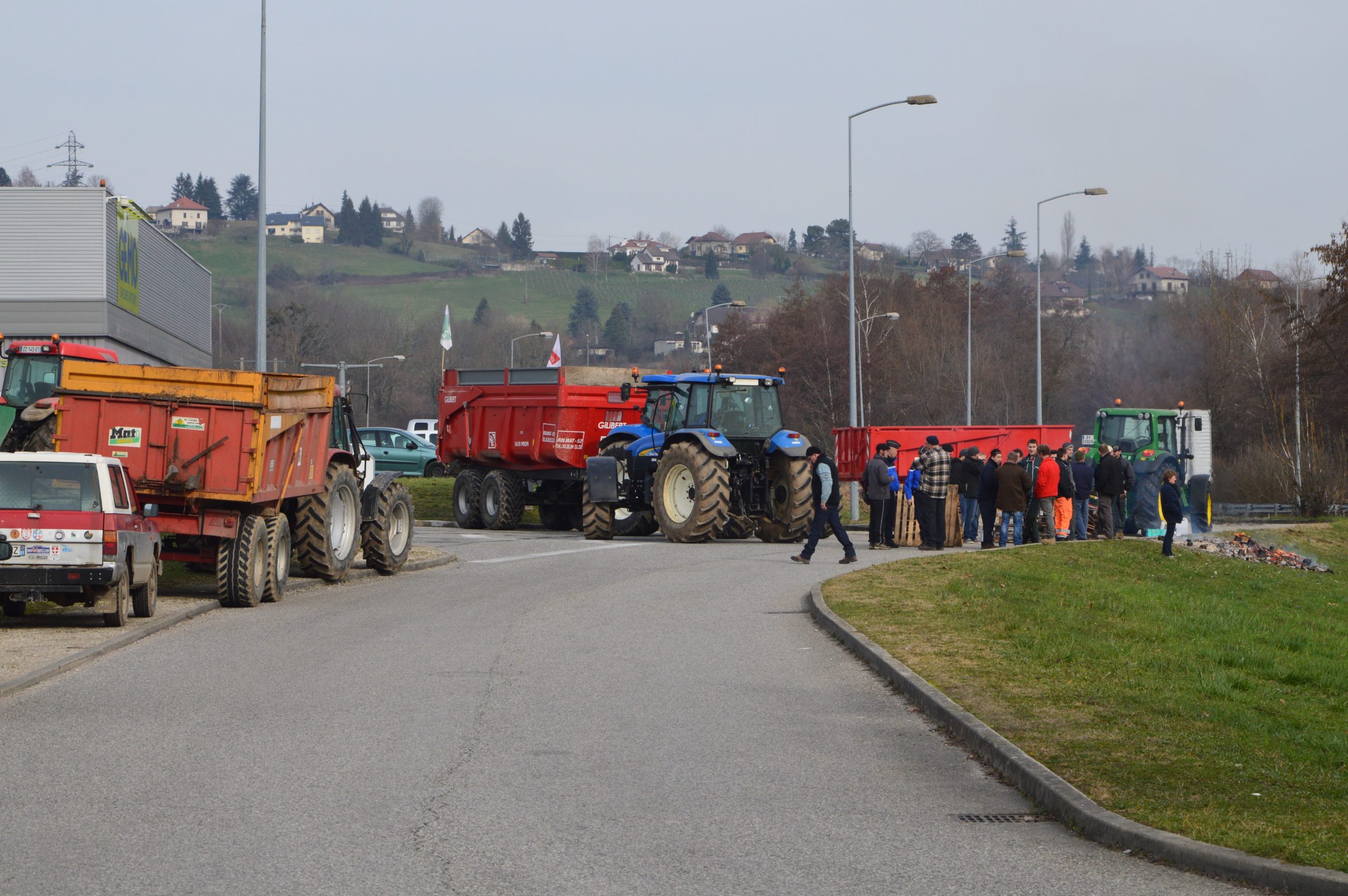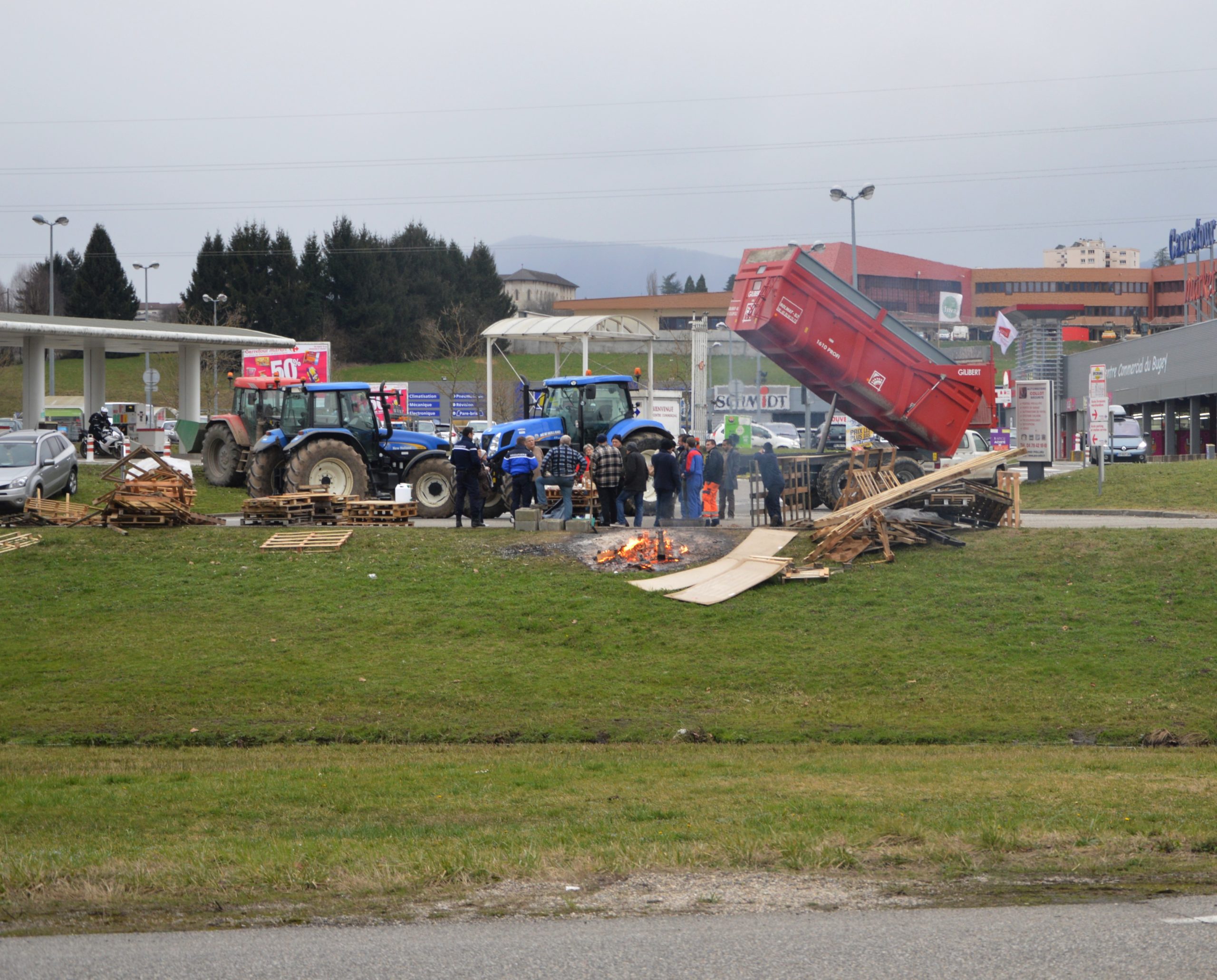 Depuis jeudi matin (18 février), une vingtaine d’agriculteurs et leurs engins bloquent l’accès des fournisseurs de Carrefour Market de Belley.