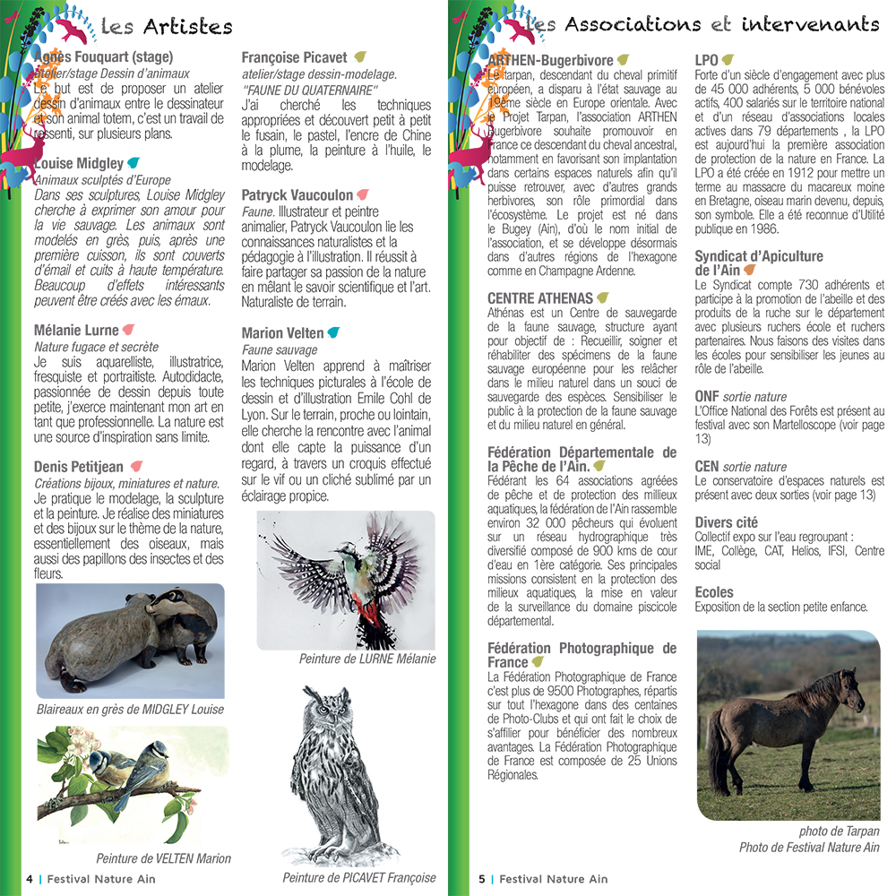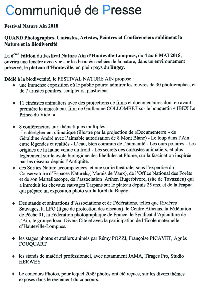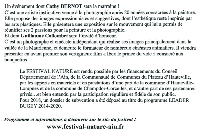 Ce festival, axé sur la Nature et la Biodiversité, se veut aussi un évènement porteur du développement et de la promotion de notre Commune et du Plateau d’Hauteville, du Territoire du Bugey et du Département.