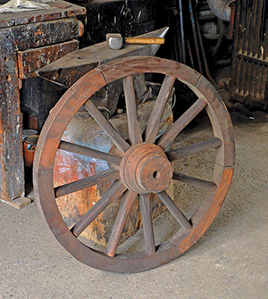 L’hiver, on coupait le bois à la hache, les planches de 7 cm d’épaisseur devaient sécher sept ans de suite (un an par centimètre), d’où une belle réserve à prévoir… Ensuite, pour bâtir la roue trois essences étaient nécessaires, le moyeu en orme, les rayons en acacia, le tour de jante en frêne. A cela, pour simplifier, le bandage de fer était fixé sur le pourtour et boulonné. La soudure avait lieu à la forge. En été, le bois pouvait se rétracter, et avec l’aide de la « refouleuse » le bandage était réajusté. Évidemment, cette présentation est fort simplifiée, car chaque étape nécessitait beaucoup d’interventions minutieuses et d’outils différents devenus souvent énigmatiques pour les hommes d’aujourd’hui, comme pour la confection des moyeux.