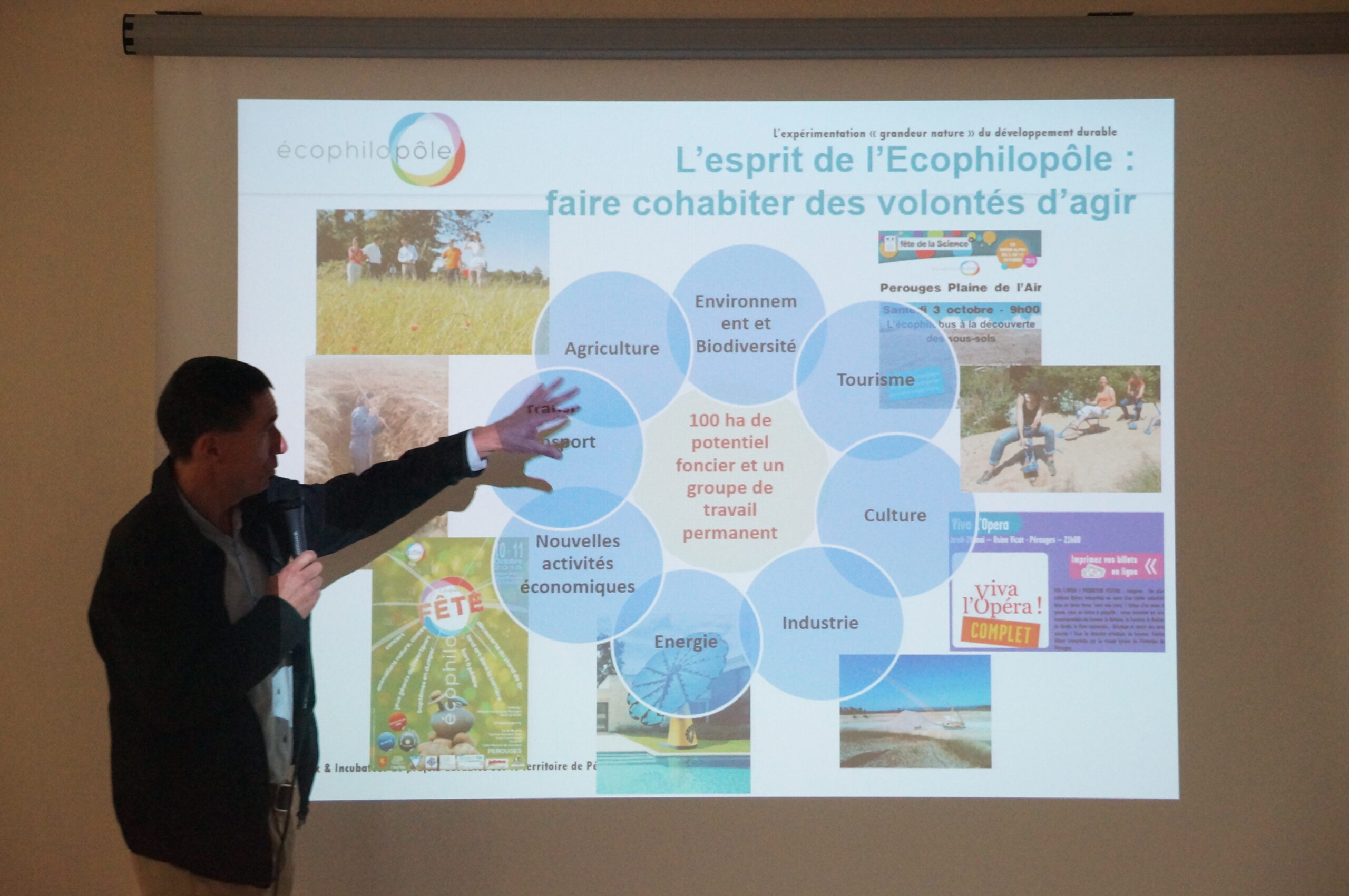 Une présentation de l’écophilopôle de Pérouges a été animée par Monsieur Jean Mochon, La Belle Idée, et Patrick Escoffier, Granulats Vicat, permettant aux participants de découvrir un projet audacieux. Son objectif : expérimenter à l’échelle d’un territoire (Pérouges – Plaine de l’Ain), un mode de collaboration innovant, avec l’intention de développer de nouveaux concepts et de nouvelles pratiques respectueux des principes du développement durable. Il s’agit d’un « think tank », incubateur de projets audacieux, tels que « l’écophilobus » et « le sentier de découverte », que les intervenants ont été heureux et fiers de présenter face à un public très réceptif.