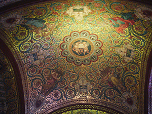 Créé en 1899 d’après les plans d’Henri Eustache, le théâtre à l’italienne du casino aixois a accueilli de nombreux artistes célèbres. En 1906, le foyer du théâtre est décoré notamment par l’ajout de motifs en mosaïque au plafond en symbiose avec les autres salles du casino.