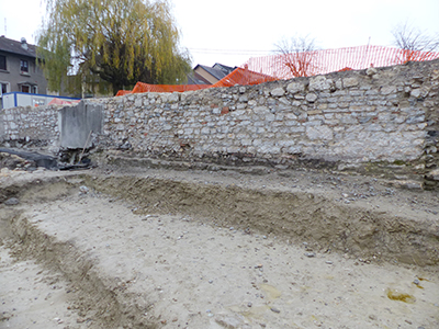 Sur la partie haute du site, les fondations des murs du couvent de la Visitation ont été reconnues ainsi qu’une zone funéraire comportant quelques tombes à l’emplacement du cloître et de l’église des laïcs. Le rempart médiéval du premier tiers du XIVe siècle, remanié au XVIIe siècle, supporte le mur nord du couvent. Au-devant, le rempart est longé par un fossé d’au moins 7 mètres de large qui s’étend au-delà de la rue de la Résistance. Des restes de caniveaux, de solins de murs et de niveaux de sols, antérieurs à la construction du couvent, ont été dégagés. À l’ouest, sur la partie basse de la parcelle, une zone artisanale datée provisoirement de la fin de XVIIIe siècle est délimitée par des fosses de stockage de chaux installées en bordure du ruisseau du Renon.