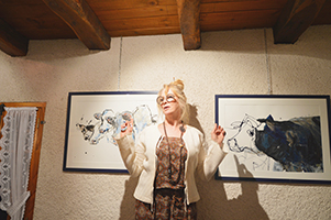 Et puis hommage en peinture aux vaches de Laurent par le peintre Geneviève Joannin. Suite à la commande d’un tableau de ses vaches par Laurent, elle a aimé ce sujet puisque 14 tableaux ont vu le jour d’où l’exposition actuelle au Caveau de Chatonod… La virtuose a su jouer entre les représentations disons classiques à l’acrylique et celles à la peinture pour carrosserie de voiture. Ces dernières, grâce au talent et à la maîtrise de Geneviève transcendent la nature par le trait et le bleu et l’or pour atteindre l’âme éternelle de ce monde animal, si riche symboliquement.