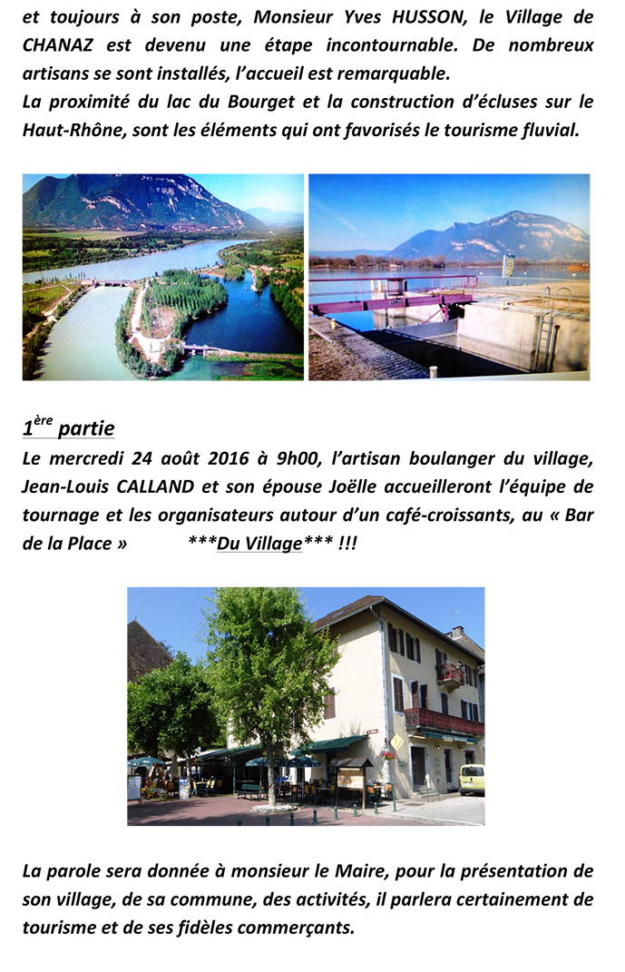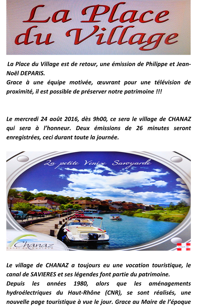 Le mercredi 24 août 2016, dès 9h00, ce sera le village de CHANAZ qui sera à l’honneur. Deux émissions de 26 minutes seront enregistrées, ceci durant toute la journée.