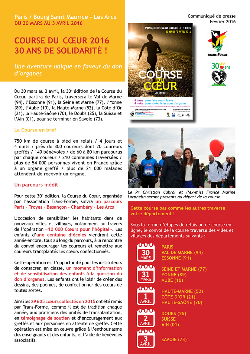 La Course du Coeur est une incroyable aventure humaine et sportive : 750 km de course à pied en relais (entre Paris et Bourg Saint Maurice) pendant 4 jours et 4 nuits pour 300 coureurs, dont une équipe de 20 coureurs greffés d’un organe. Cette année la course se déroulera du 30 mars au 3 avril et passe dans votre région.