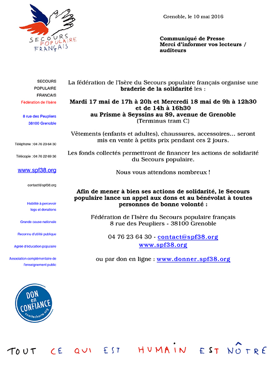 La fédération de l’Isère du Secours populaire français organise une braderie de la solidarité mardi 17 mai de 17h à 20h et mercredi 18 mai de 9h à 12h30 et de 14h à 16h30 au Prisme à Seyssins.