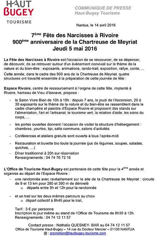 Le jeudi 5 mai, jour de l’Ascension, aura lieu la Fête des Narcisses à Vieu d’Izenave autour de la découverte, du bien-être, de la randonnée et du patrimoine.