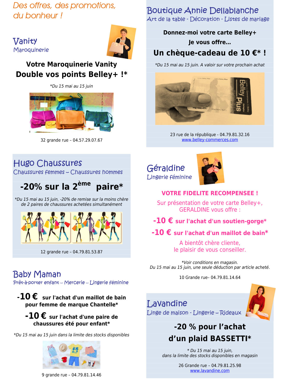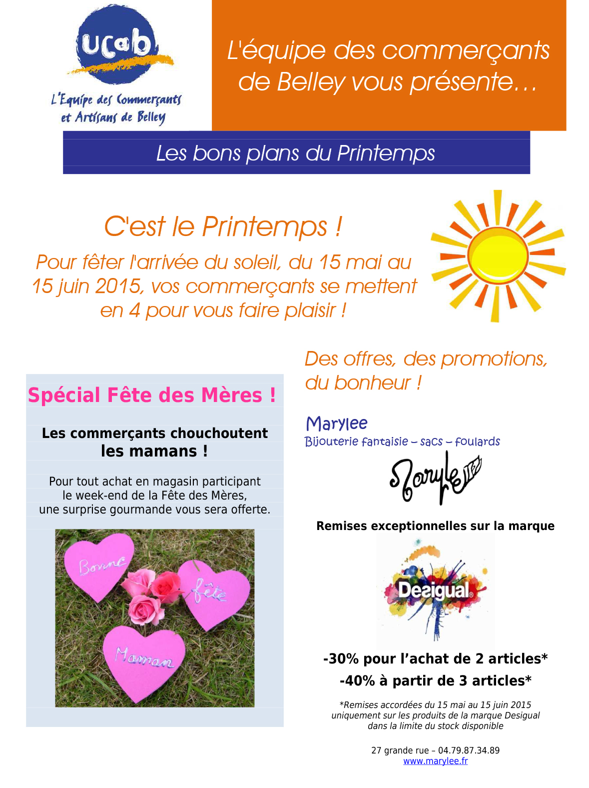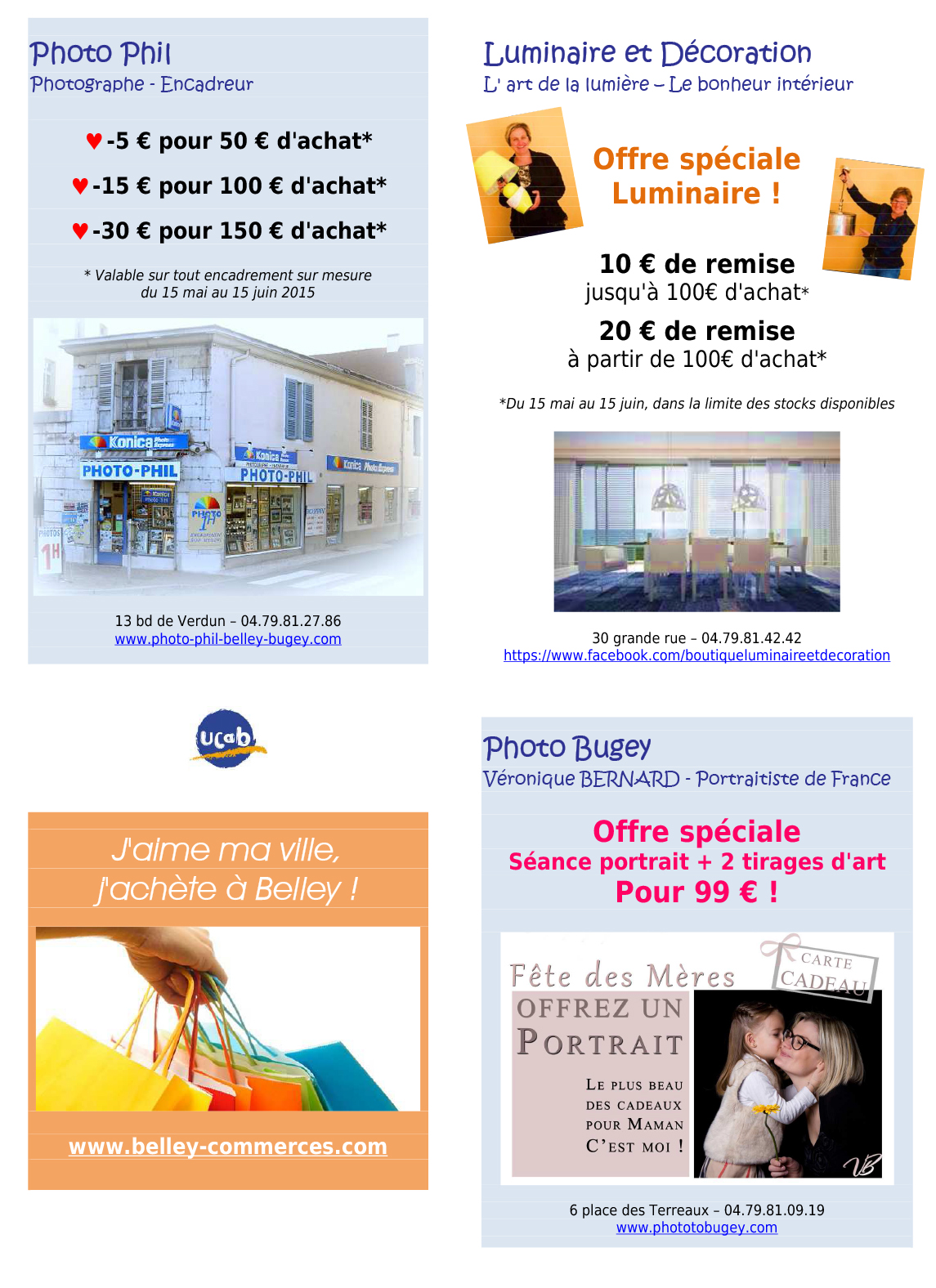 Mai272015 Categories: Actualités, Commerces, Evenementiel, La vie des commerces, UCAB de Belley, Unions CommercialesPar Anne27 mai 2015Laisser un commentaire Author: Anne Post navigationPreviousPrevious post:Belley – Séance de dédicaces samedi 6 juin 2015 à la librairie « Entre parenthèses »NextNext post:Marignieu – Stages de poterie