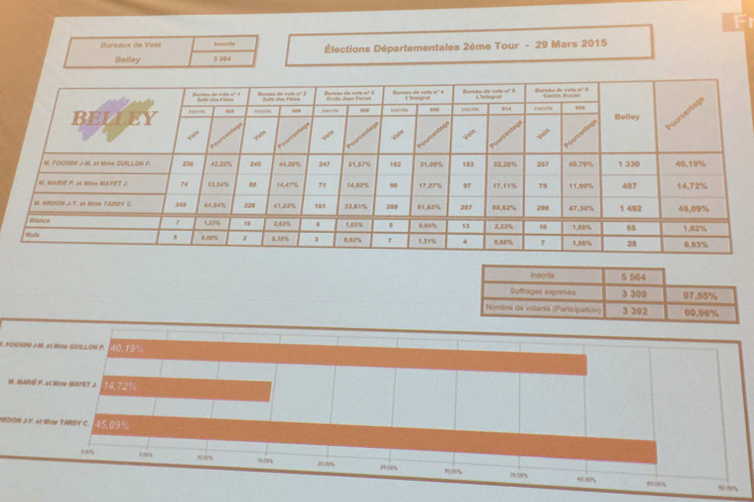Mar292015 La salle Dans l’attente des résultats Belley Le canton Myriam KELLER, Jean-Yves HEDON, Carène TARDY et Georges GERIN Categories: Actualités, Les Cantonales 2015, Politique, SociétéPar Anne29 mars 2015Laisser un commentaire Author: Anne Post navigationPreviousPrevious post:INFO ROUTES – Mise aux normes du Tunnel du Chat – Restrictions de circulation jusqu’au vendredi 03 avrilNextNext post:PEYRIEU – VIDEO – Découvrez le film du spectacle « L’Orchidée et le papillon » de L’ADAPT AIN