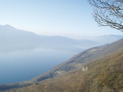 Très rapidement, après avoir pris un peu de hauteur, quelques belles échappées sur le lac laissent présager du panorama final. Au loin, l’abbaye de Hautecombe se détache majestueusement au pied du mont de la Charvaz, face au lac. Après quelques bifurcations bien indiquées, la deuxième partie de la promenade s’effectue en sous-bois et se termine par quelques passages un peu raides. Vous parvenez, alors, à une petite clairière agrémentée d’un banc de pierre, offrant plusieurs chemins. Pour accéder à la grotte, empruntez le premier sur votre droite. 50 m plus loin, bifurquez sur le petit sentier à droite. Vous apercevrez des marches taillées dans la pierre et une rampe de sécurité, la grotte se situe juste en contrebas.